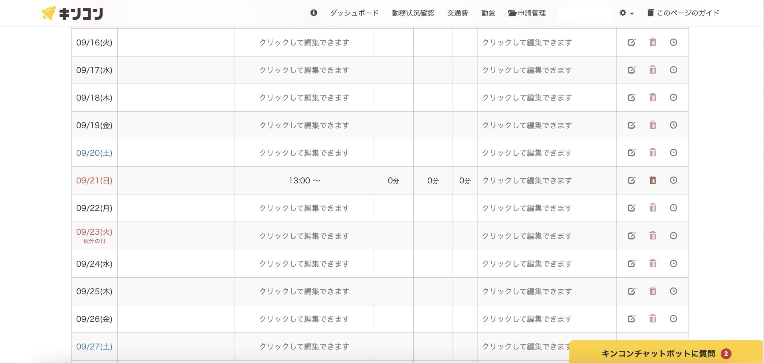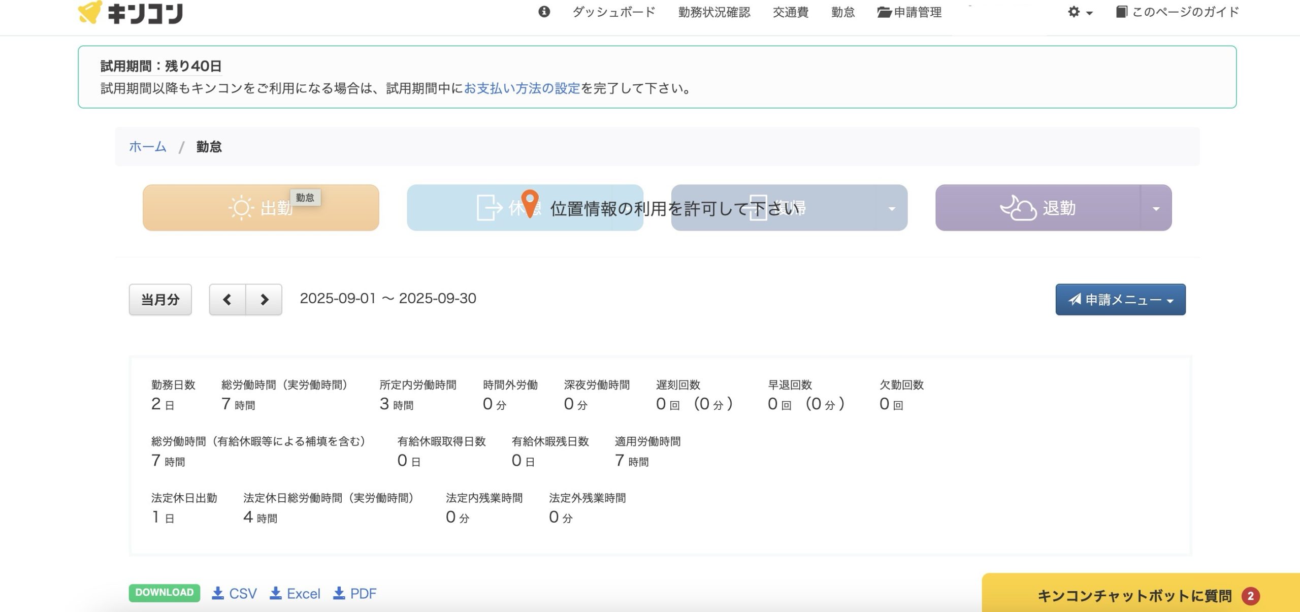 出勤画面を見てみましょう。右上の「勤怠」ボタンから見に行くことができました。