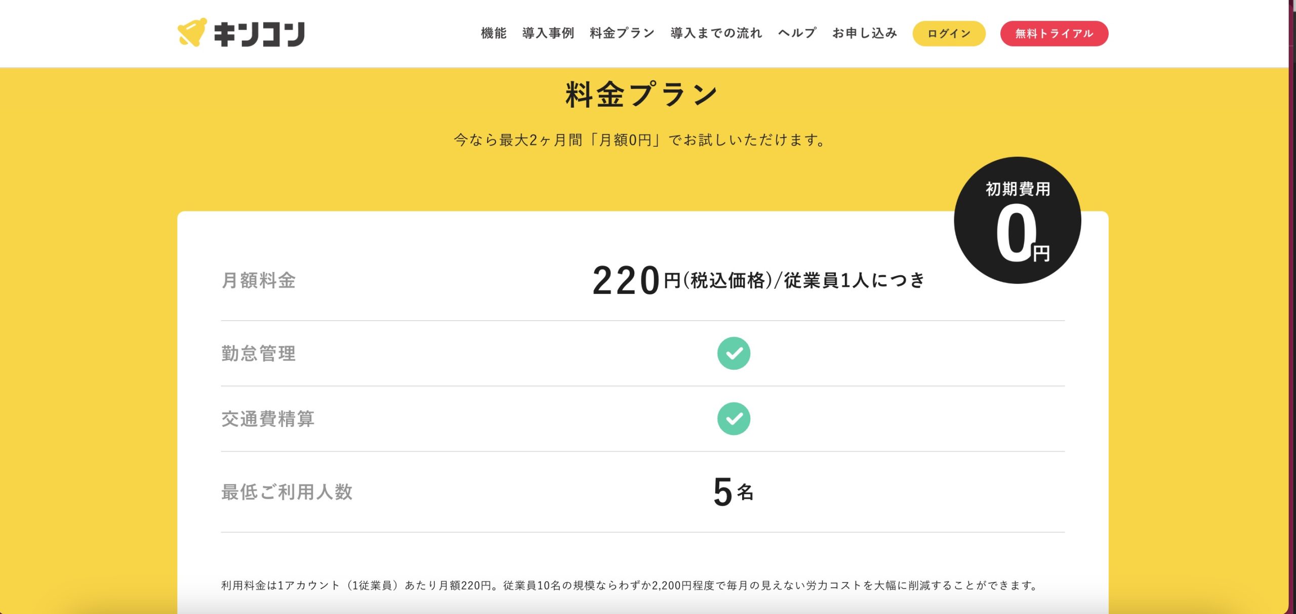料金はこのような感じになっています。シンプルでわかりやすいですね。10名の会社だと月額2200円で、初期費用もないようです。
