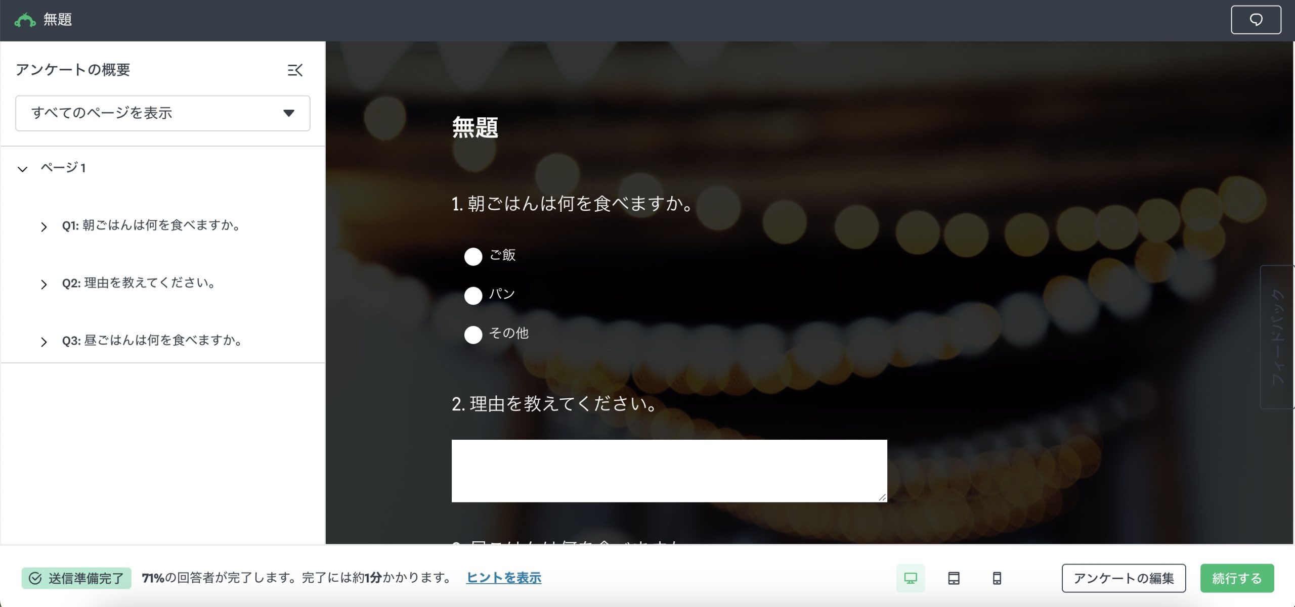 このような感じで、左側で作成した質問が並んでいます。スマホやタブレットでどのような見た目になるのかも確認できました。