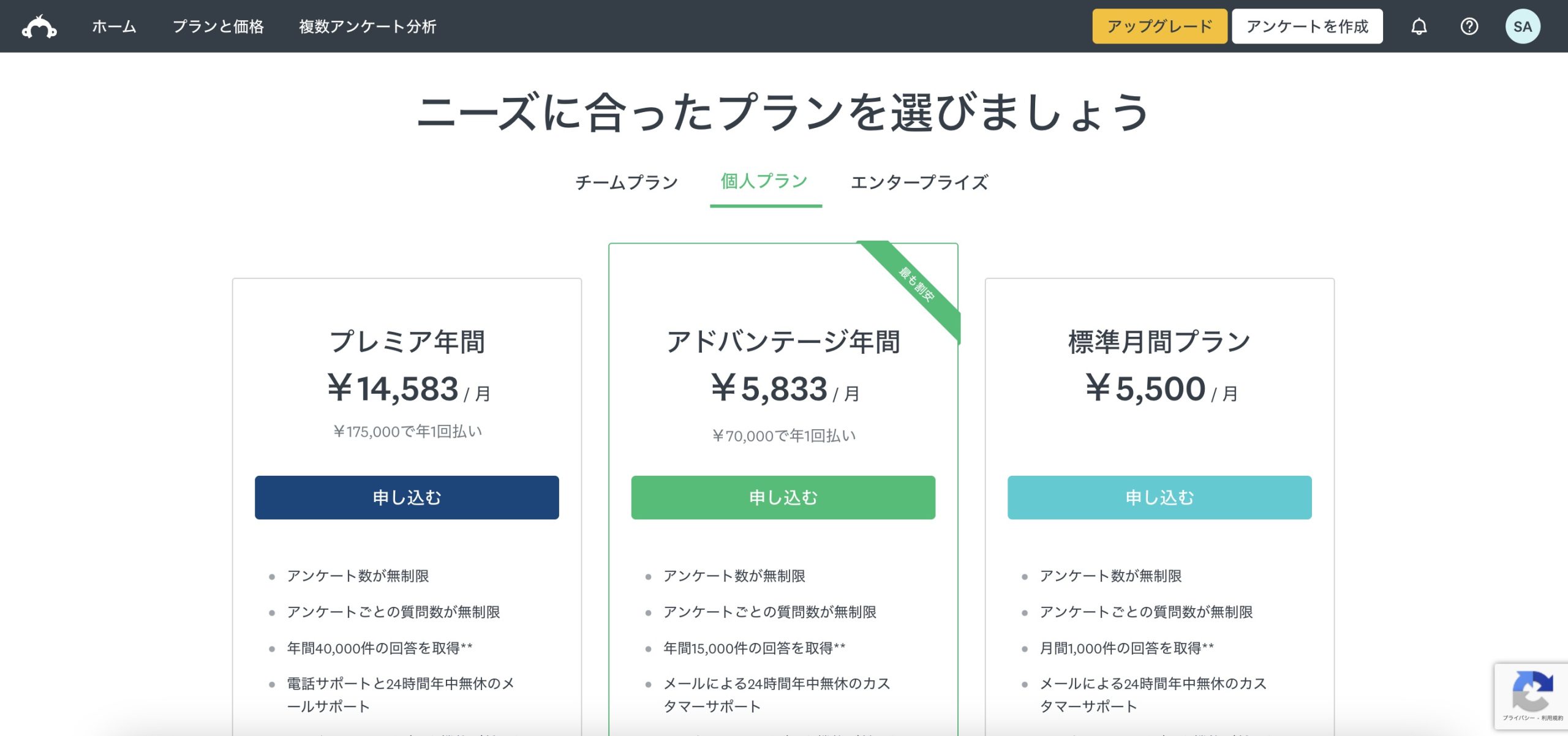 SurveyMonkeyには様々な料金プランがあるようです。チームプラン、個人プラン、エンタープライズなどがあります。